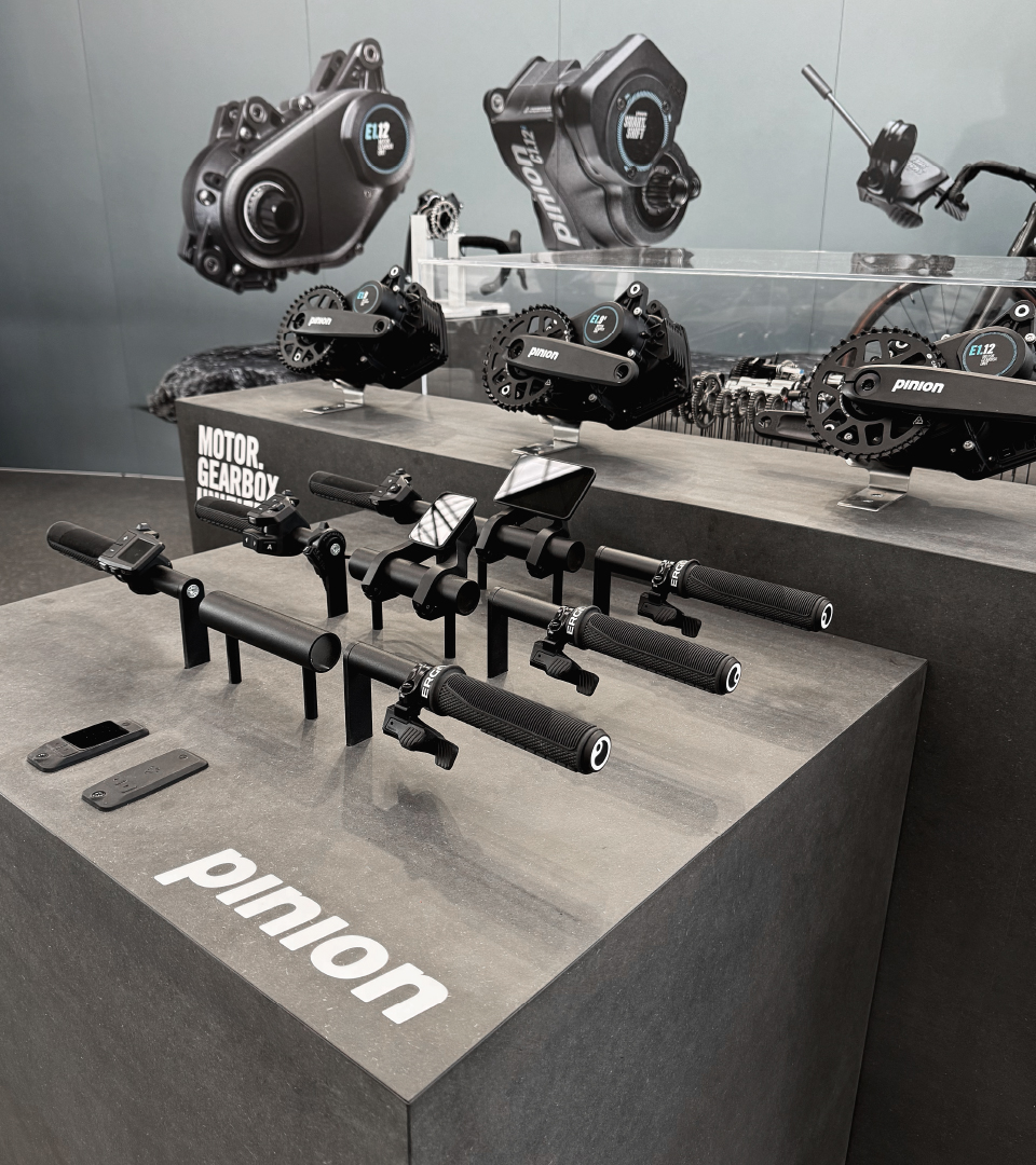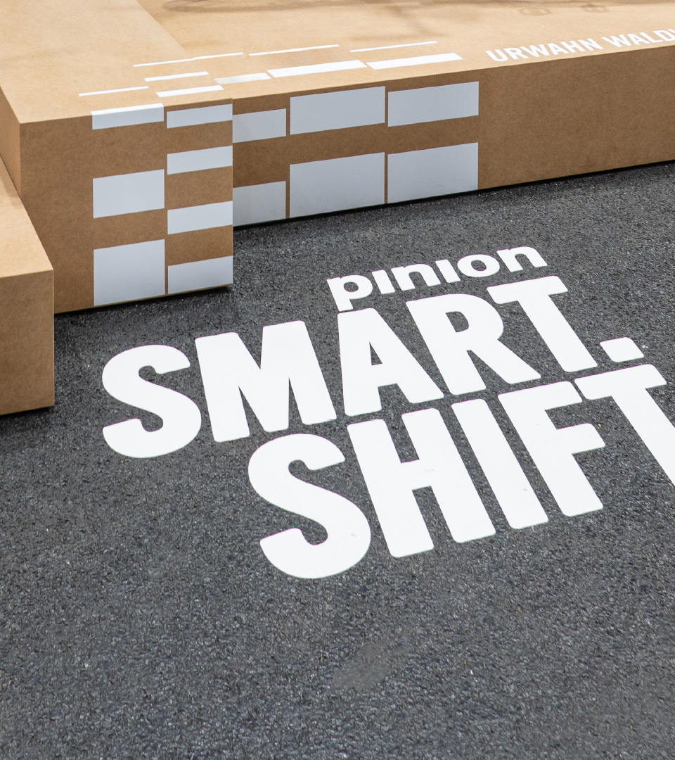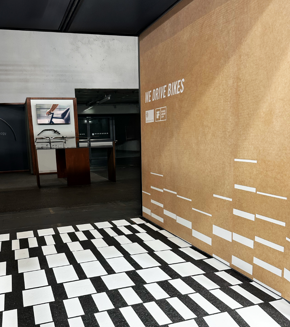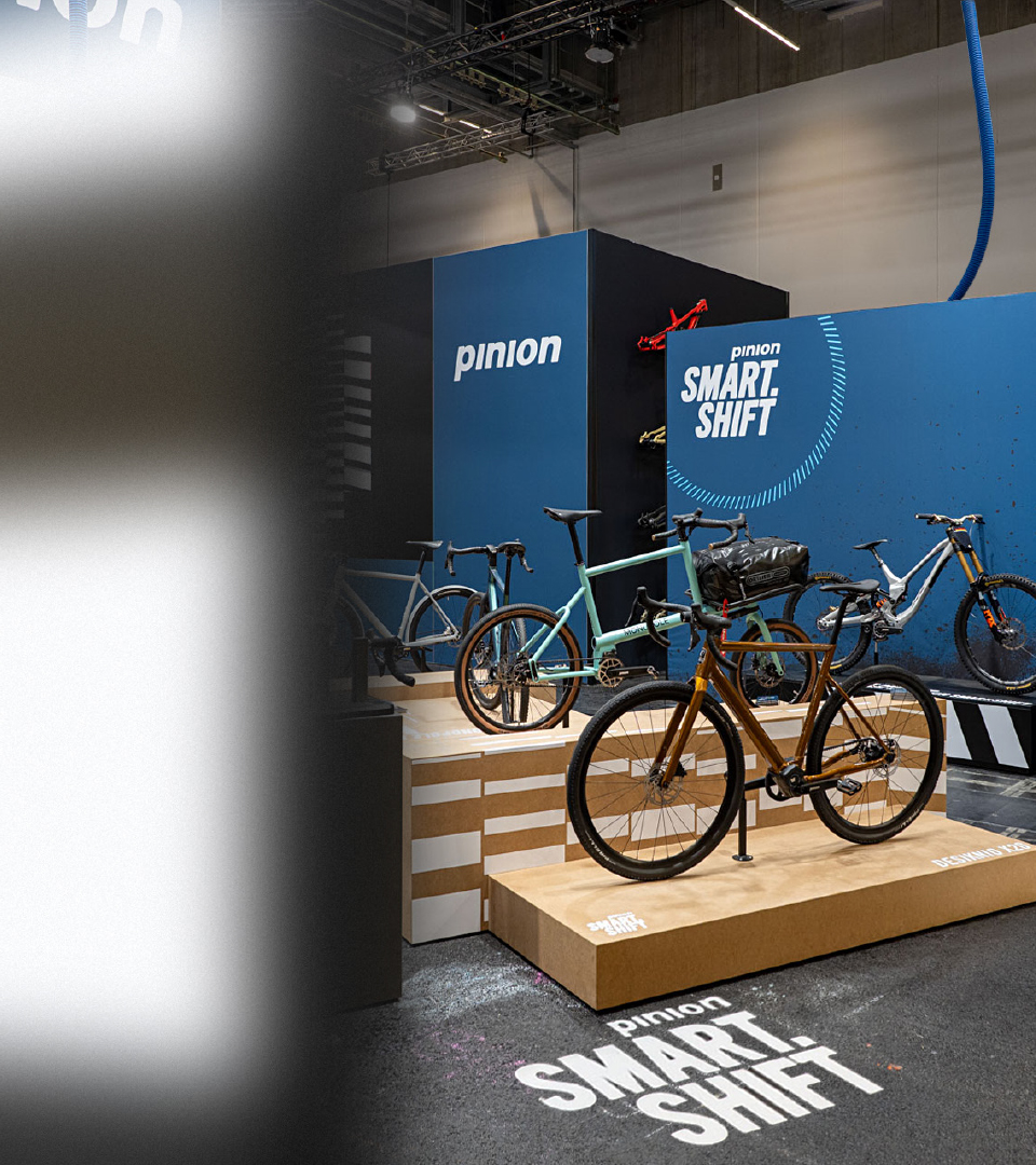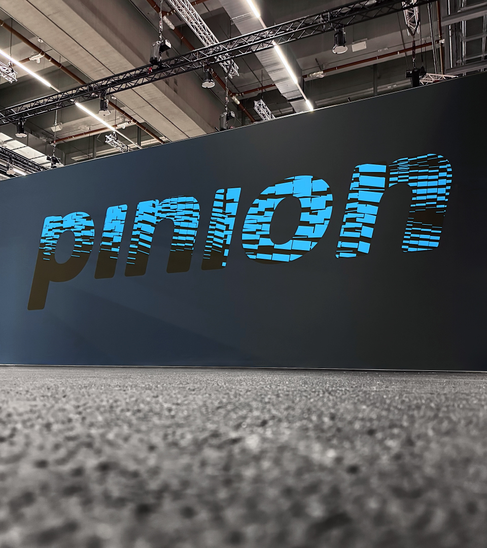 When gearbox graphics turn into architecture, something magical happens. For Pinion at Eurobike, we created a 30 × 13 m booth that let visitors step right into the heart of the brand — and into the mechanics themselves. Raw MDF podiums in the shape of the iconic gearbox graphic rose from the bare concrete floor, forming a striking landscape of black and brown layers. Above, floating cubes echoed their geometry: some glowing as ceiling lights, others carrying the branding — a subtle play of structure, light, and identity tying floor and ceiling together. Four tall LED pillars with massive blue cables were positioned deliberately across the booth, showing the animated gearbox visuals in perfect sync — creating a sense of momentum and precision throughout the space.