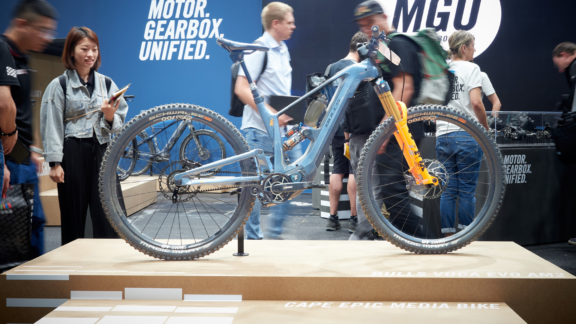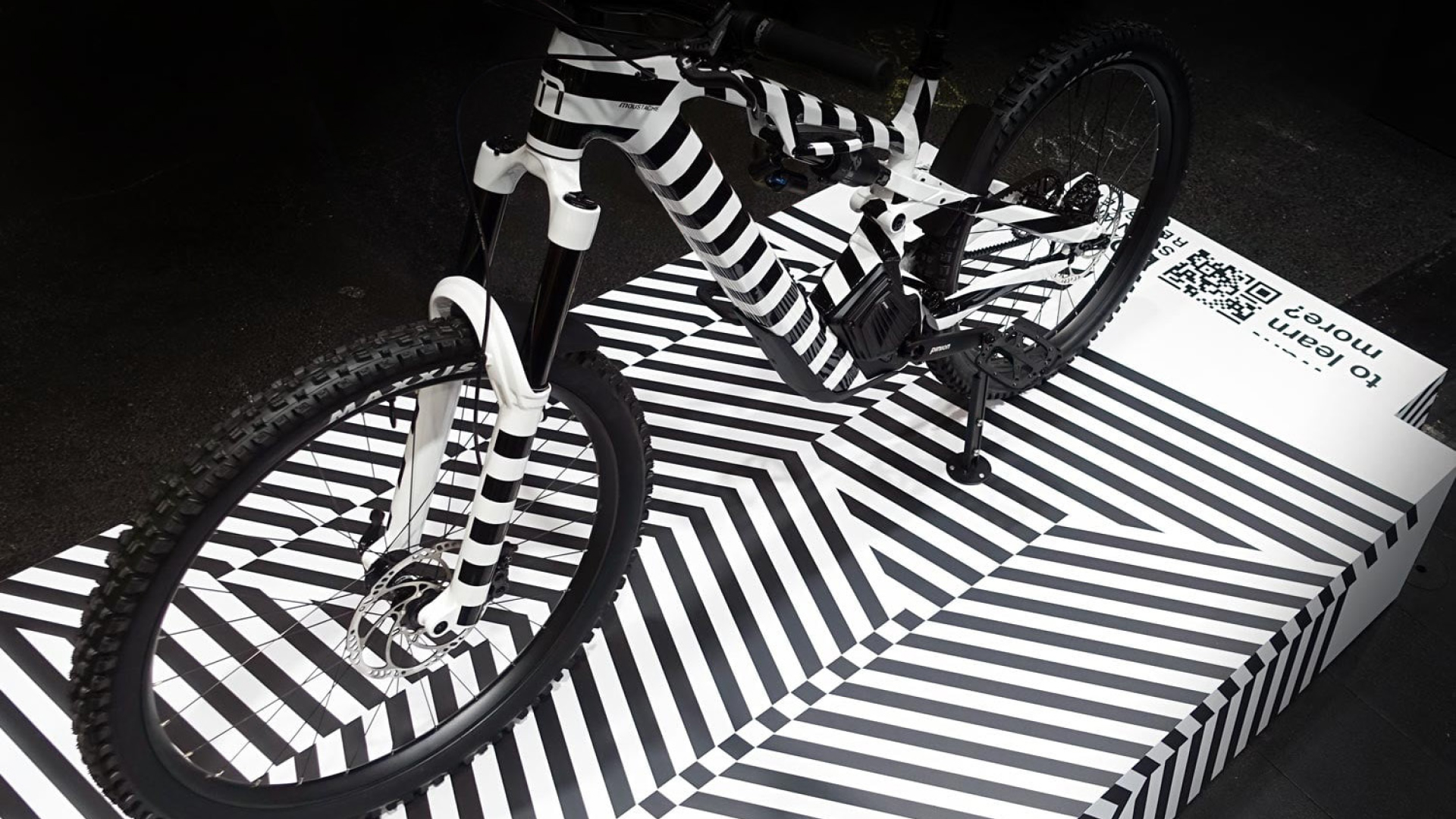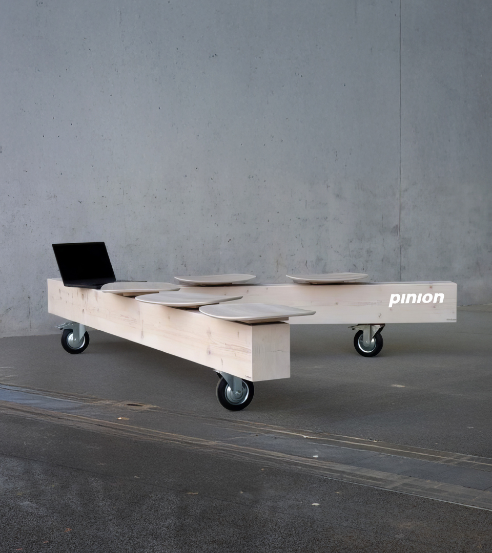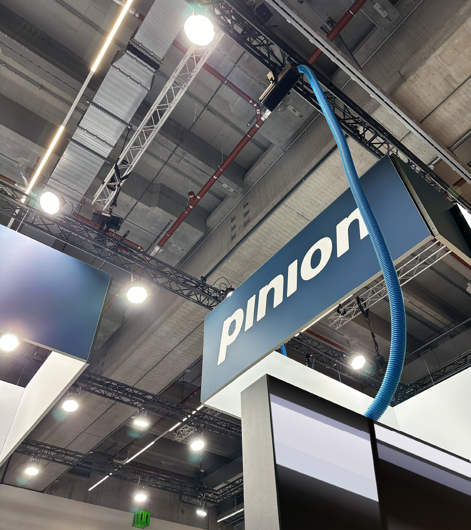 When gearbox graphics turn into architecture, something magical happens. For Pinion at Eurobike, we created a 30 × 13 m booth that let visitors step right into the heart of the brand — and into the mechanics themselves. Raw MDF podiums in the shape of the iconic gearbox graphic rose from the bare concrete floor, forming a striking landscape of black and brown layers. Above, floating cubes echoed their geometry: some glowing as ceiling lights, others carrying the branding — a subtle play of structure, light, and identity tying floor and ceiling together. Four tall LED pillars with massive blue cables were positioned deliberately across the booth, showing the animated gearbox visuals in perfect sync — creating a sense of momentum and precision throughout the space.